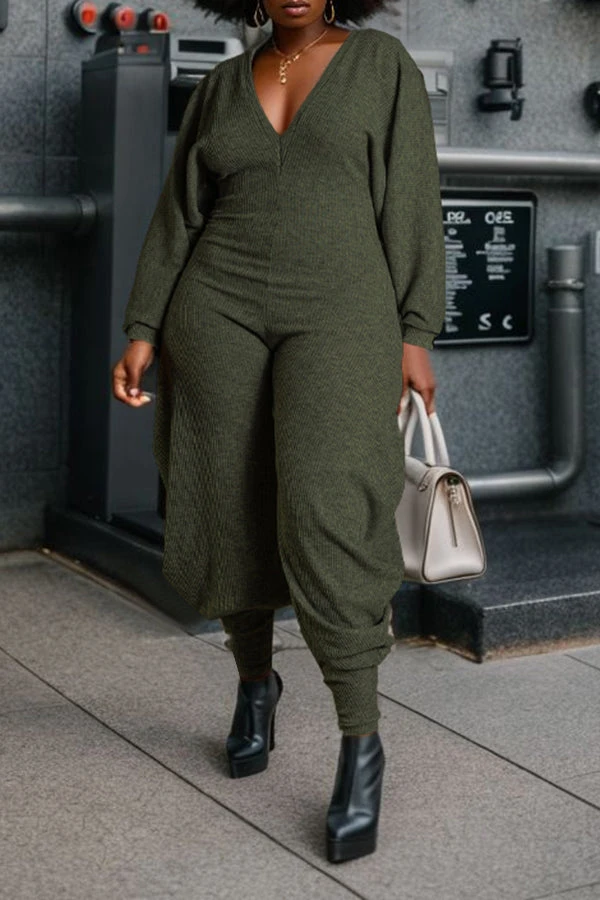 Stay on trend this season in our new casual, deep v neck jumpsuit. We especially love the solid color fabric and think this piece will be a new favorite in your closet!